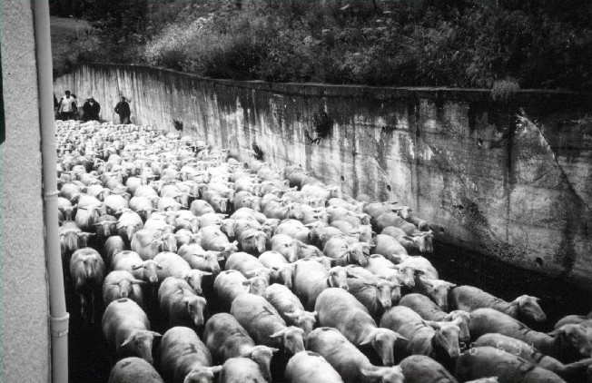 Le spectacle était impressionnant, le troupeau de brebis, soulevant la poussière s’étirait de la maison Bataille jusqu’à La Remise. Il y avait là plus de 3 000 brebis et leurs agneaux et les bêlements, les sonnailles, les cris des bergers les aboiements des chiens se conjuguaient pour donner un concert assourdissant. Le troupeau, en plus des béliards et béliardes, comptait un âne transportant les sacs les plus lourds ainsi que deux ou trois boucs qui faisaient l’attraction avec leurs rubans multicolores et leur odeur caractéristique.