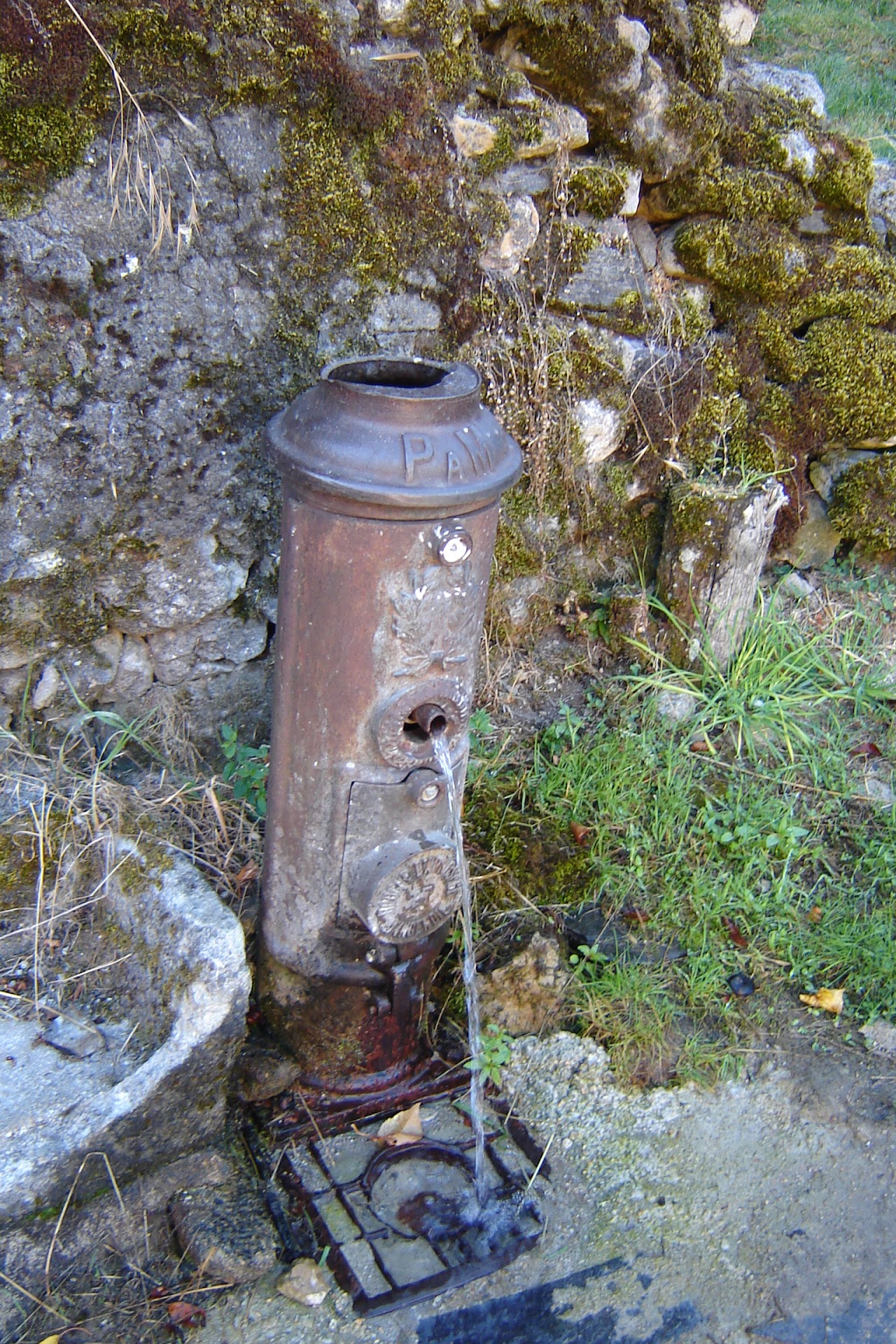 • Les fontaines en fonte, d’où l’eau n’était délivrée qu’à la mise en rotation rapide de la manivelle  horizontale, qui les coiffaient. Ces fontaines, au demeurant très belles, grâce à leur ingénieux système participaient à l’écologie avant l’invention du terme. Toujours selon mes souvenirs, trois de ces fontaines sont mises en place : une au dessous de la boulangerie Mazoyer, une au fond du Bleymard, une au bas du boulagiou de la Barri-Basse.
