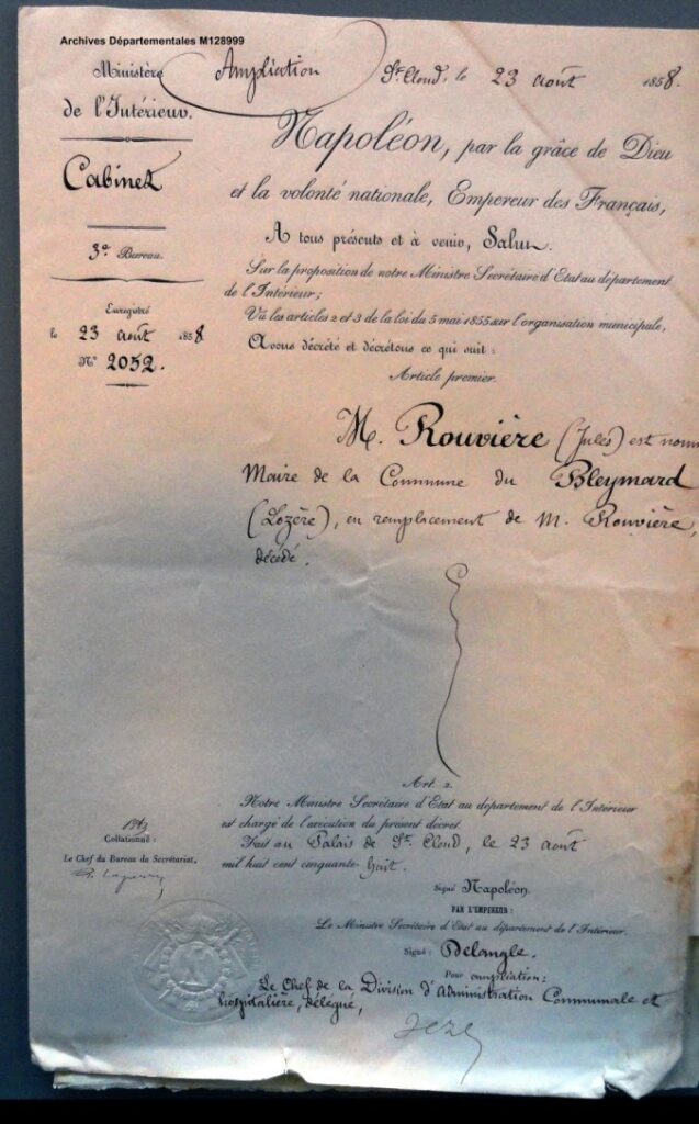 Arrêté portant nomination du maire, Jules Rouvière, par l’Empereur le 23 août 1858.