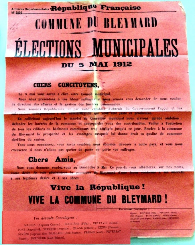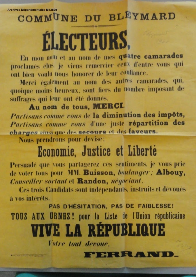 On peut consulter, aux archives départementales, un dossier contenant des documents officiels sur les élections de 1833 ,1834, 1858 , 1900, 1908 et 1912 (archives départementales : cote M 12899). J’ai retenu :