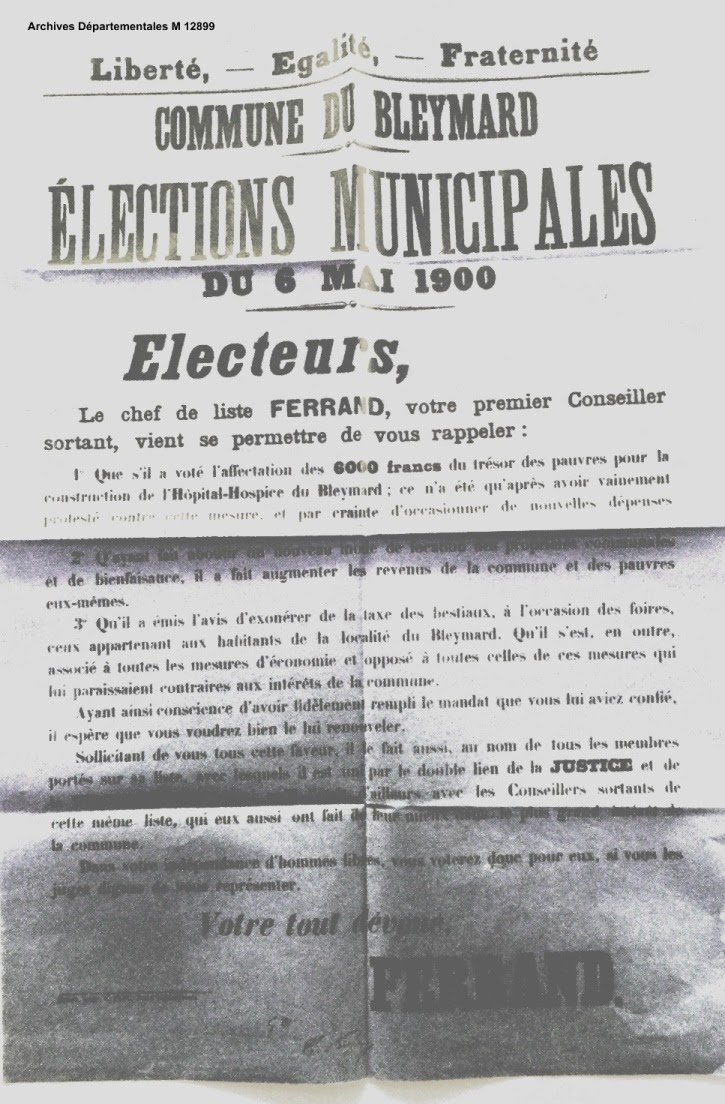 Les affiches où sur l’une d’entre elles, M° Ferrand revendique en même temps s’être longtemps opposé à la construction de l’hôpital et avoir voté les crédits pour cette réalisation. L’hôpital dont il s’agit, géré par le Dr Masseguin, devint assez rapidement le siège du cours complémentaire « à la cime du Bleymard ».