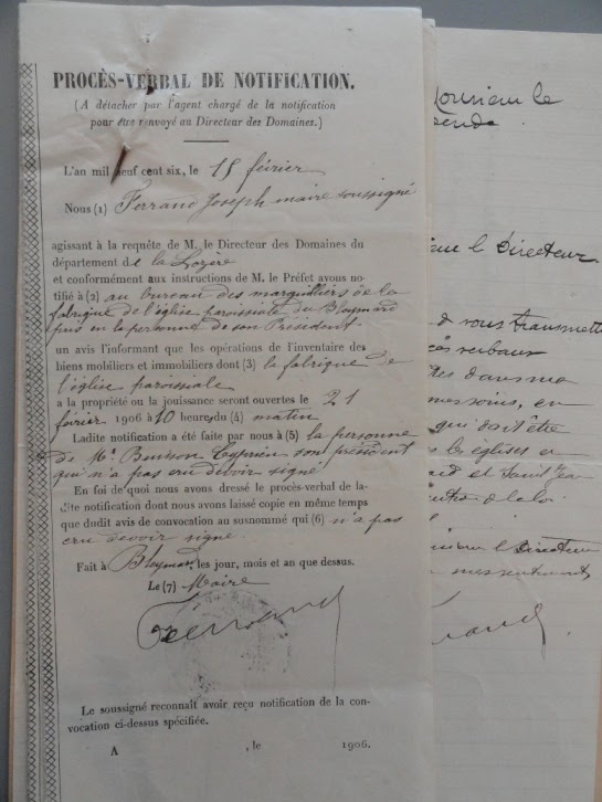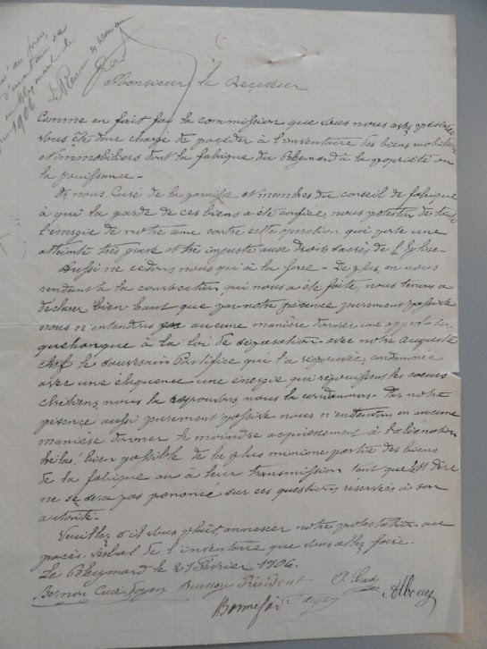 Or, nous, Curé de la paroisse, et membres du conseil de fabrique à qui la garde de ces biens a été confiée, vous protestons de toute l’énergie de notre âme contre cette opération qui porte une atteinte très grave et très injuste aux droits sacrés de l’Église.