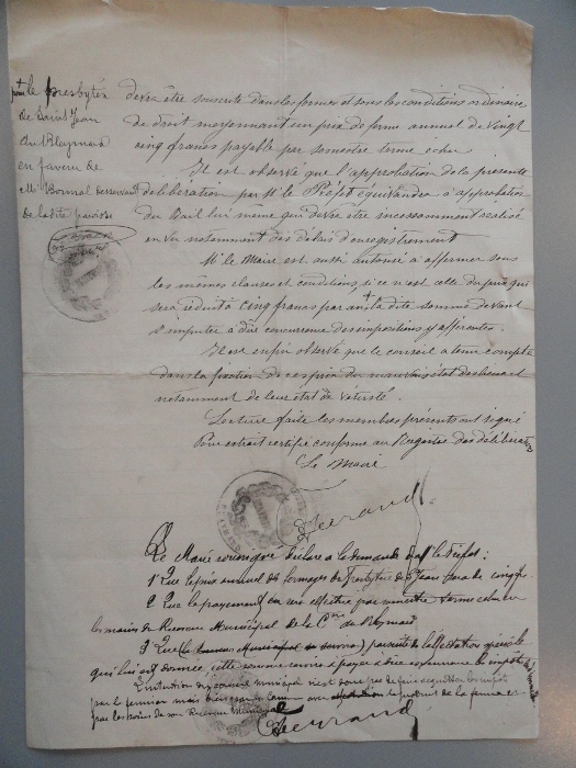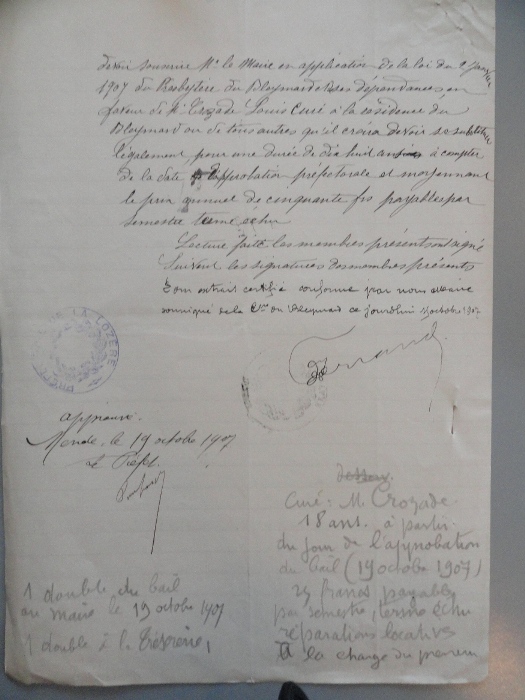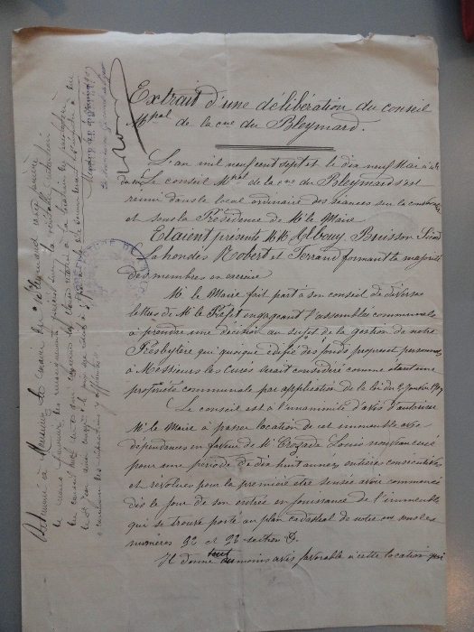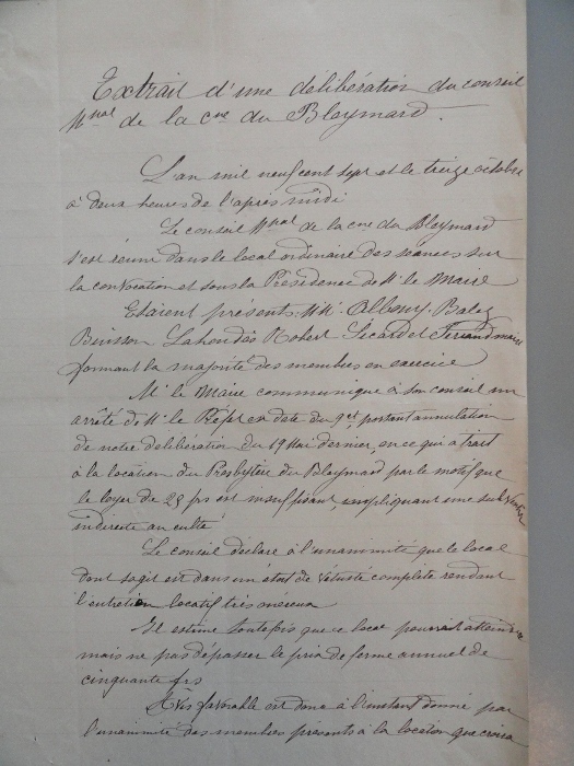 Le 19 octobre 1907, le Conseil Municipal (M° Ferrand, maire, MM. Albouy, Balez, Buisson, Lahondès, Robert et Sicard), prend acte de l’arrêté et après avoir souligné « l’état de vétusté complète du local », décide néanmoins d’augmenter le loyer « sans que celui-ci dépasse cinquante francs par an ».