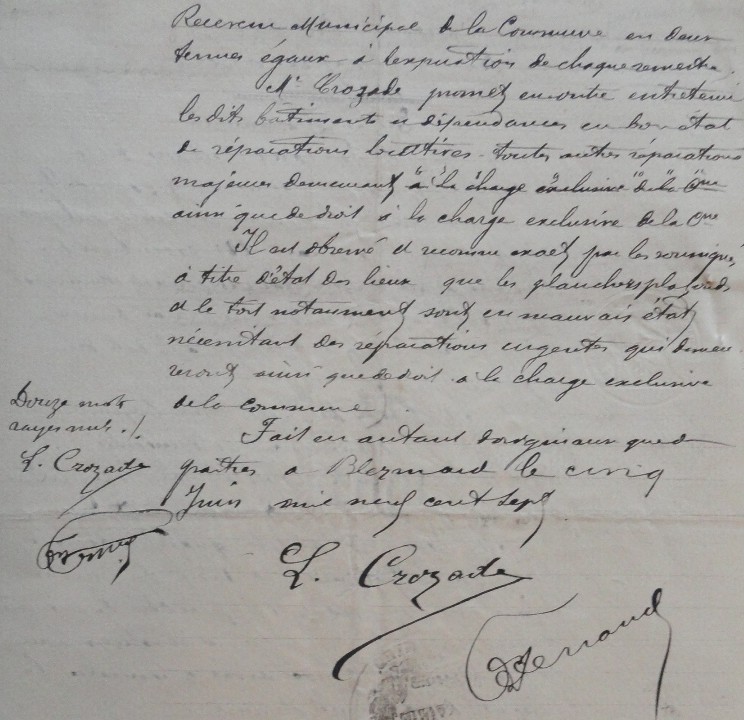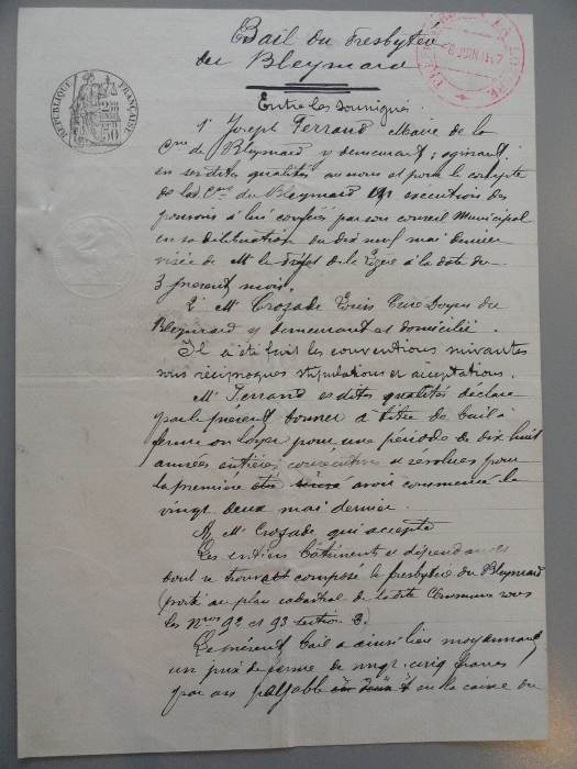 Le 19 mai 1907, le conseil municipal (Maire M° Ferrand) à la suite de diverses injonctions du préfet, décide d’autoriser le maire à passer un bail avec le nouveau curé doyen, M. Crozard, pour la location du presbytère qui « quoique édifié sur les fonds propres et personnels de MM . les curés serait considéré comme propriété communale ». Le loyer sera fixé à 25 francs annuels pour 18 ans.