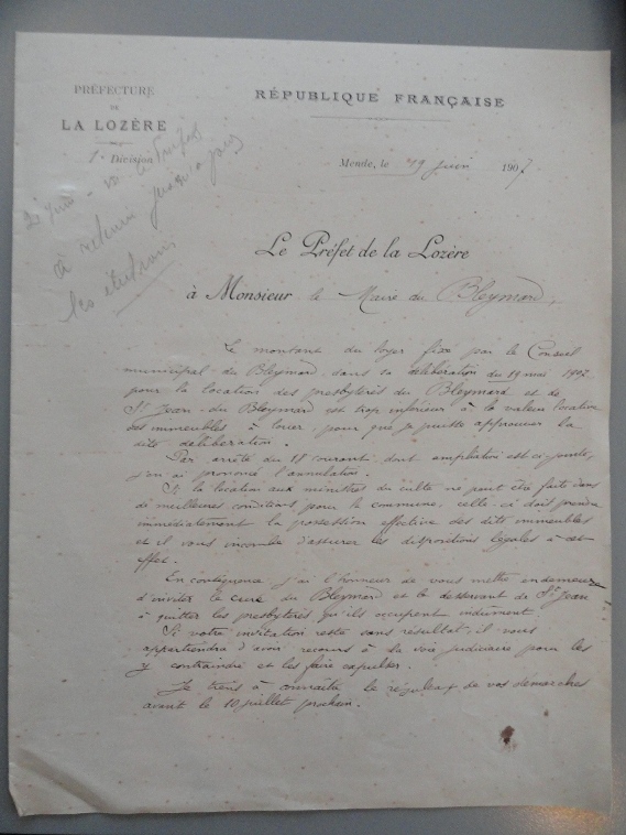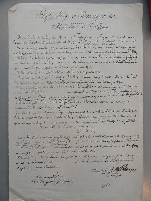 Il semble qu’il y ait eu ensuite des négociations, mais le 19 octobre 1907 le préfet prend un arrêté, lequel « en application de la loi du 9 décembre 1905 » et considérant que l’insuffisance du loyer « implique une subvention indirecte au culte, interdite par l’art. 2 de la loi de 1905 », annule la délibération du 19 mai.