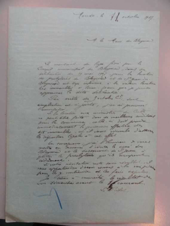 Le 19 juin le préfet écrit au maire pour lui annoncer l’annulation de la délibération du 19 mai, le loyer étant insuffisant, et le met en demeure d’inviter le curé à quitter le presbytère en ayant recours à la voie judiciaire pour le faire expulser si son invitation est sans résultat.