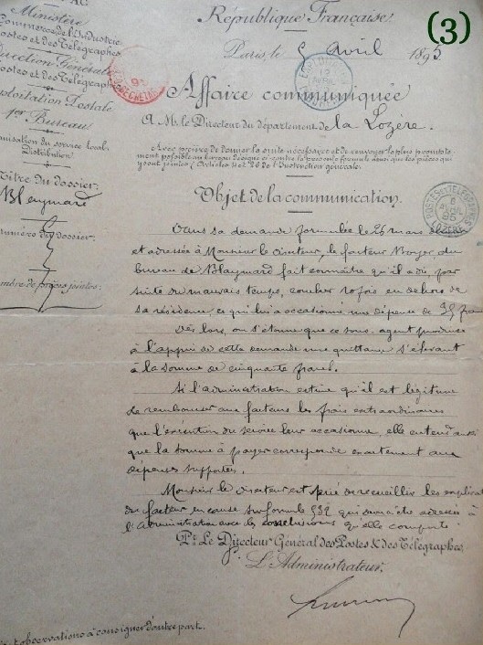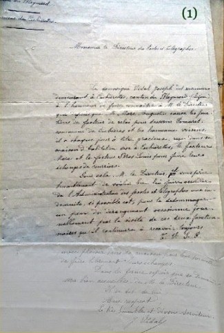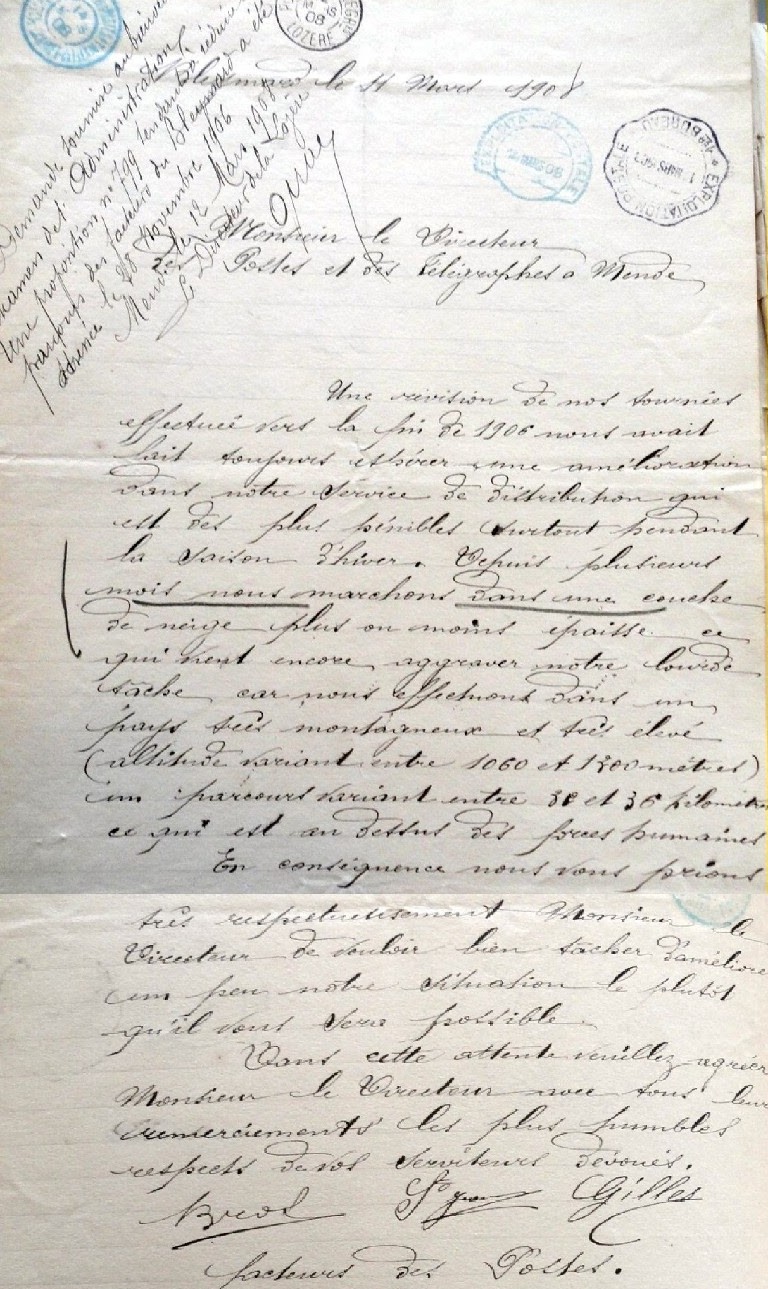 M. Vidal, meunier à Cubierettes reçoit, tous les jours, à son domicile le facteur du Bleymard et un sous-facteur relais afin qu’ils échangent leur courrier à l’abri. Il présente une requête au Directeur en vue d’obtenir une indemnité pour le dédommager de ce dérangement (et peut-être du coup de rouge qu’il offrait aux facteurs à cette occasion). Il termine sa missive par cette formule que je trouve délicieuse :