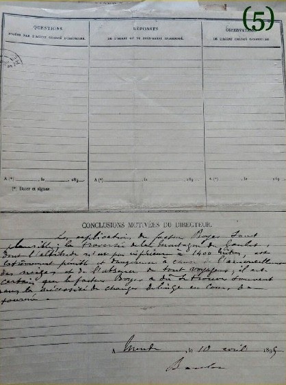 À l’issue de l’hiver de 1895, il demande un défraiement de 50 F pour ces hébergements, mais il présente une quittance de seulement 35 F, car les petits services (abri, vêtements…) ne sont évidemment pas facturés.