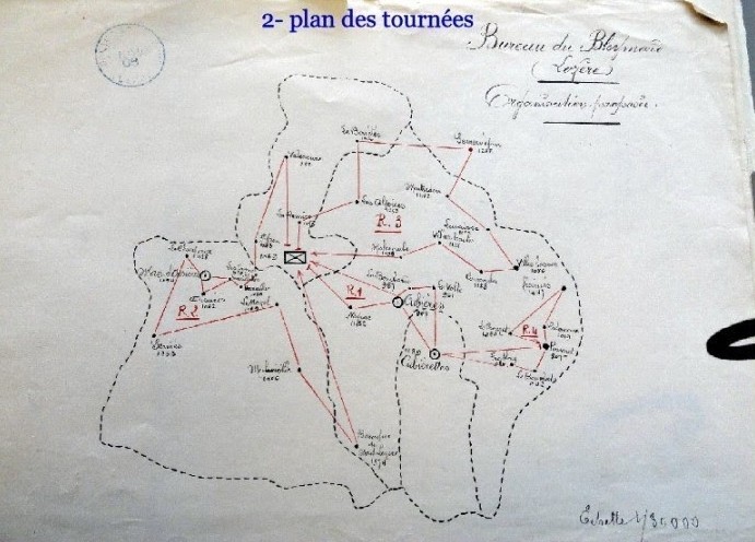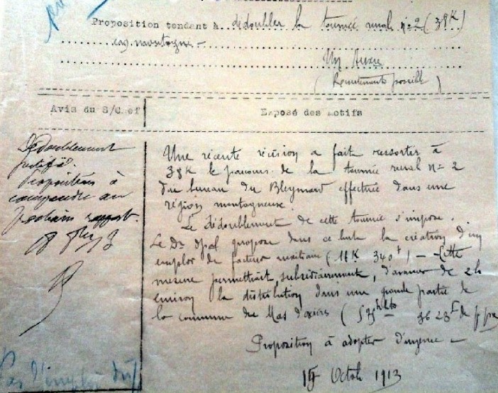 Une tournée auxiliaire sera créée pour desservir le village du Bleymard, celui de Saint-Jean et quelques écarts. La création de cette tournée, de 11 km, réduira la charge de l’épouvantable tournée n° 2 (37,8 km) devenue d’autant plus pénible que « l’instituteur de Serviès2 s’est abonnée à un journal quotidien ».
