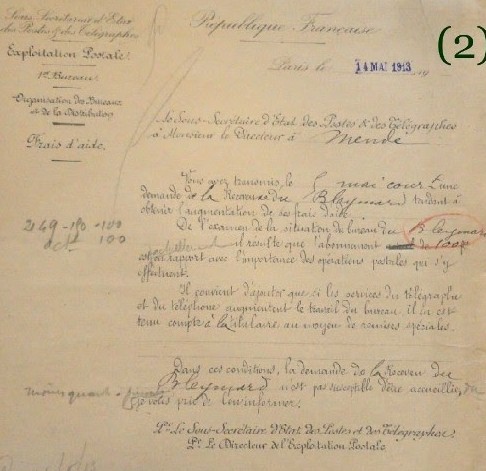 Selon les recoupements que j’ai pu faire, Le Bleymard a été raccordé à la ligne télégraphique Mende – Villefort entre les années 1870 et 1880. Ce service était à la charge des communes ce qui ne manquait pas de générer des réticences. C’est ainsi que le bureau télégraphique de Bagnols à été fermé puis remis en service au cours de la même année (1880).