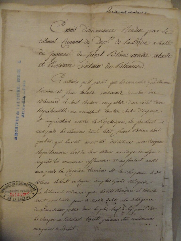 L’acte d’accusation produit par le procureur devant le Tribunal Criminel de Mende est lourd : il fait grief à l’inculpé « d’avoir fait preuve de forfaiture… d’avoir excité les volontaires à la licence, au désordre et à la désertion… d’avoir provoqué leur désobéissance aux lois et autorités légitimes… d’avoir outragé et menacé les membres de la municipalité et tenu des propos incendiaires… de n’avoir conduit à l’armée que 12 hommes sur les 23 qui lui avaient été confiés… »