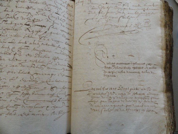 L’an mil cinq cens soixante sept et le quatriesme jour du moy d’octobre, très chrestien prince Charles, par la grace de Dieu roy en France regnant, au lieu du Bleymar et dans la salle haulte de la maison de noble Estienne de Sabran, seigneur des Alpiers, illec estans congregez, assemblez et domparans en personne led. Noble Estienne de Sabran, noble Gabriel de Sabran son oncle, maistres Blaize de Sabran, Jehan Reversat, Estienne et Anthoine Fabres, freres, Jehan Vinhal lieutenant, Jehan Mallechane notaire, Anthoine des Ayfres praticien, Anthoine Mothon, Estienne Folchier, Guillaume Mazel, Guillaume Baldit, Estienne Beys, filz de feu Jehan, Estienne Beys, filz d’Estienne, Michel Fabre, filz de feu Blaize, Claude Talon, Michel Beys vieulx, Michel Beys jeune, Jehan Daude, Barthelemy Cayroche, Jehan Martin, filz de feu Michel, Vidal Ranc, Guillaume Donzel, Jacques Guollabert, Guillaume Bonel, charpentier, Anthoine Chambon vieulx, Anthoine Folchier, Durant Leynadier, François Deveze, Anthoine Bès, Raymond Maleval, Guillaume Folchier, Jehan Privat, Jehan Maurin, Jehan Pontier ponteyro, André Paulet, Baethelemy dict Jacques Bays vieulx, Privat Alegre, Jehan Pontier bastier, Guillaume Chambon, Anthoine Beys filz de feu Armand, Anthoine Beys guasquet, Anthoine Berengier, Jehan Durant bastier, Michel Sollier, Claude Vidal, Pierre Grefuelhe, Anthoine Sochon, Jehan Jordan, Pierre Vidal, Pierre Moret, Barthelemy Folchier, Jehan Assenat, Blaize Roux, Barthelemy Reynal, Michel Sabran, Anthoine Labrou, Pierre Bonet, Estienne Corregier, Barthelemy Rebol, Vidal Vincens et Jehan Gibert, tous faisans la plus grande et sayne partie des habitans dud. Bleymar, ausquelz en la presence de moy notaire soubzigné et des tesmoingz cy bas nommez, a esté expozé et remonstré par la parolle et orguane dud. noble Estienne de Sabran, comme led. Villaige du Bleymar estoit grandement peuplé et muny de beaucoup d’habitans y receans et domicillians, et tant gens literez de qualité que artizans et aultres de basse qualité et condition, dans lequel villaige ou son paroisse y avoit ordinaire exercisse, suyvant l’eedict du roy, de deux religions, sçavoir les ungz soustenans et exerceans la religion chrestienne et eglize reformée, les aultres et le plus grand nombre exerceans et soustenans le party de l’eglize romaine, et parce que en faisant chacun son devoir et exerceant sa religion entre aulcunes, y avoit journellement rixes, querelles et esmotions, reprochans et desdaignans les ungz les aultres en leur exercisse et religion par rizées et mocqueryes, les ungz en sortans des prieres et presches ordinaires, et les aultres en sortant d’ouyr la messe, chose grandement scandaleuse et odieuse à veoir et ouyr, le tout procedans de telles particularitez et differences de religion, dont ne s’en pouvoit ensuyvre par ung juste jugement de Dieu que tout malheur s’il n’y avoit prompte reformation tellement policée que telz mocqueurs et seditieux ne soyent punys de ce qu’ilz ont fait par le passé et que pourroient faire pour l’advenir, à quoy estoit très requis et nécessaire principalement pourveoir et remedier ; d’ailleurs aud. Villaige avoit aultre grand desordre et desbordement touchant le passaige, nourriture et entretenement de la gendarmerye, ordinairement y passant et repassant, pour autant que les ungz, pour le mauvais voulloir et inimittié qu’ilz ont contre les aultres, tachent et procurent par tous moyens possibles leur ruyne et destructionde lad. Gendarmerye, et pour ce executer font venir et acheminer aud. Villaige plusieurs compaignyes de soldatz tant d’une religion que d’aultre, par lesquels sont souventesfoys battuz et tourmentez, et après leurs biens et maisons vollez et pillez, et quepys est, après telle pillerye acheptent eulx mesmes des soldatz les meubles, marchandises et denrées desrobées, et encore pys toutes compaignyes de soldatz, estans avec ou sans chiefz et cappitaines, entrent ordinairement aud. Villaige du Bleymar, le plus souvent sans avoir commission ne charge, et pour si peu de monde qu’ilz soyent, soy rendent maistres et lesd. Habitans en telle subgestion.