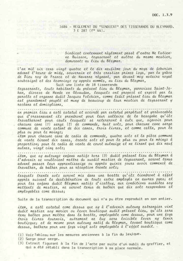 Le 19 février 1624, les professionnels du tissage de laine, serge et cadis, créent un syndicat des tisserands du Bleymard, dont le règlement est déposé devant Guillaume Bonnel, notaire au Bleymard.