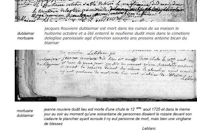 Ces tristes événements sont annuels et il ne peut que s’ensuivre une dégradation du terroir et le rendre des plus stériles, et le peu de terre qui reste dans nos champs, presque tous dans une pente raide et de très mauvaise nature, terre noire, mouvante et légère, ce qui ne peut que donner qu’une très petite récolte et rendre conséquemment la paroisse très misérable, laquelle souffre annuellement des grandes pertes de ses cabaux, ce qui peut provenir de la nature de son terrain ou du défaut de salaison, qui pour combler de malheur, est surchargée d’impôts et de dettes particulières qu’elle a été forcée de contracter à cause de ses calamités, de sorte que, après avoir travaillé comme des forçats toute l’année, nous n’avons pas de quoi subvenir à nos besoins et payer nos charges ; quoique propriétaires nous sommes pis que des rentiers, mais nous osons espérer que d’ici peu de temps tout changera en notre faveur, et que par les arrangements que va prendre notre monarque, nous aurons un sort plus heureux.