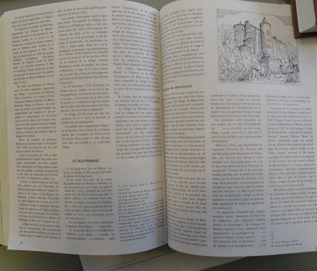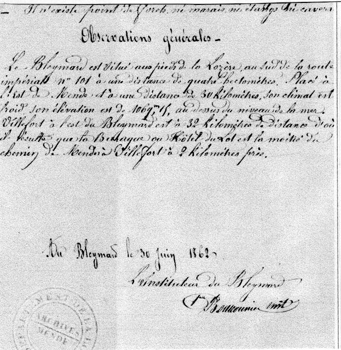 Mais dès 1813, le rapport de tournée du préfet Gamot donne une description intéressante du Bleymard et de ses environs, et en 1874 en exécution d’une directive générale, M. du Président de la 3ème République, M. Teissier rédigera sa « monographie » (29 mai 1874).