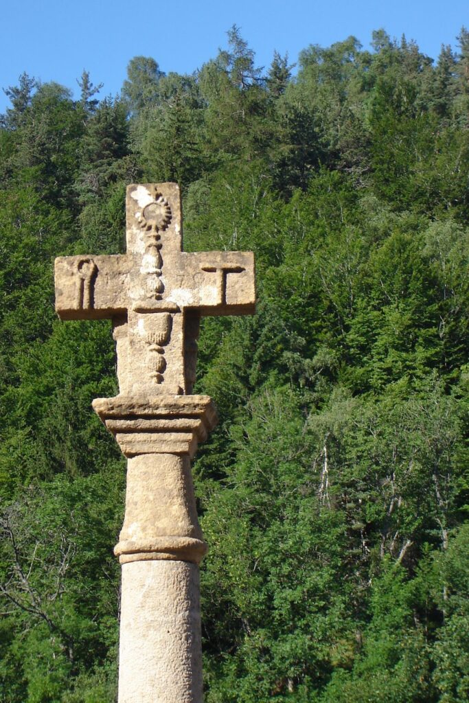 Le village possède une croix en pierre d’une exécution remarquable. On y distingue un coq équeutant des grappes de raisin artistiquement sculptées, tous les instruments de la passion, un ostensoir et un calice. (cf. photos ci-dessus)