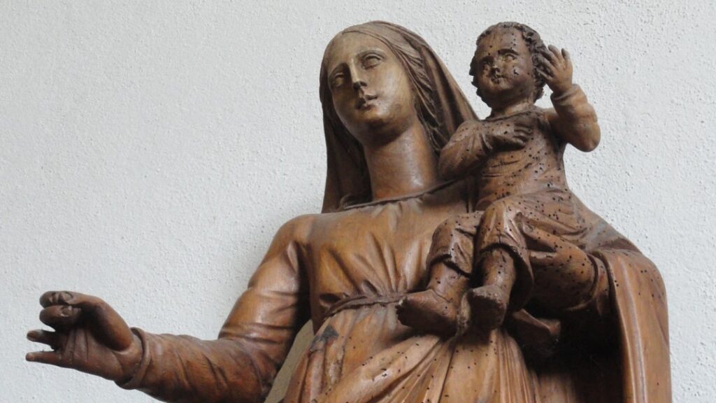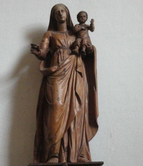 Une belle statue de la vierge, en bois, y est également déposée. Elle a subsisté et on peut la voir dans l’église actuelle. On peut voir d’autres photographies de cette belle statue sur le site annexe.